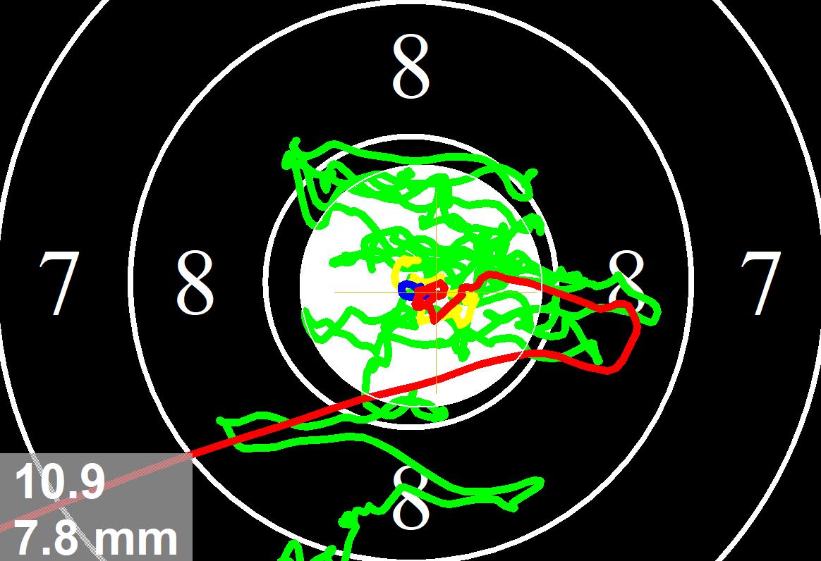 Insgesamt zu unruhig in das Ziel gekommen, ein wenig zu weit rechts. Die Ruhe vor dem Schuss ist in Ordnung, wie auch der Schuss.